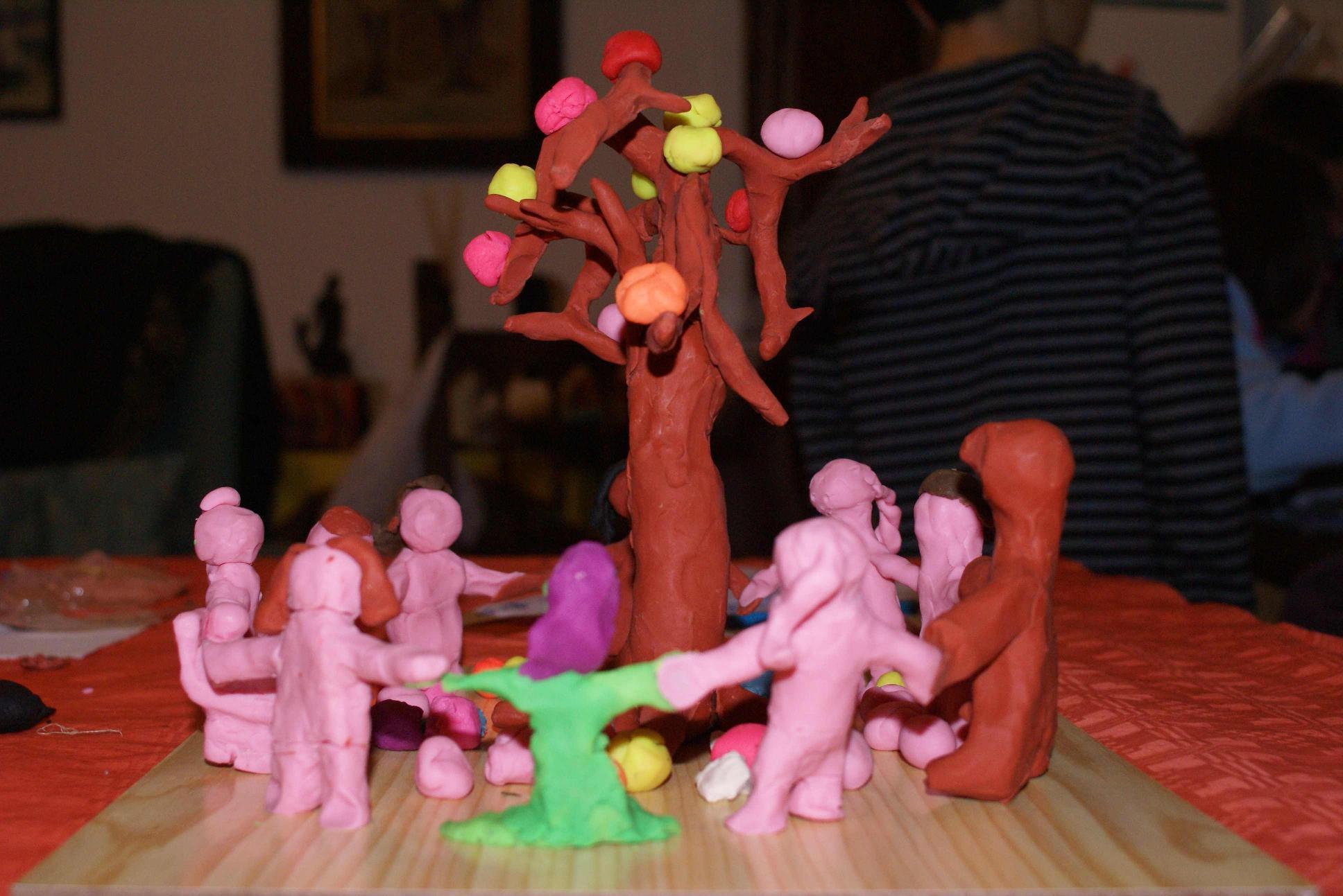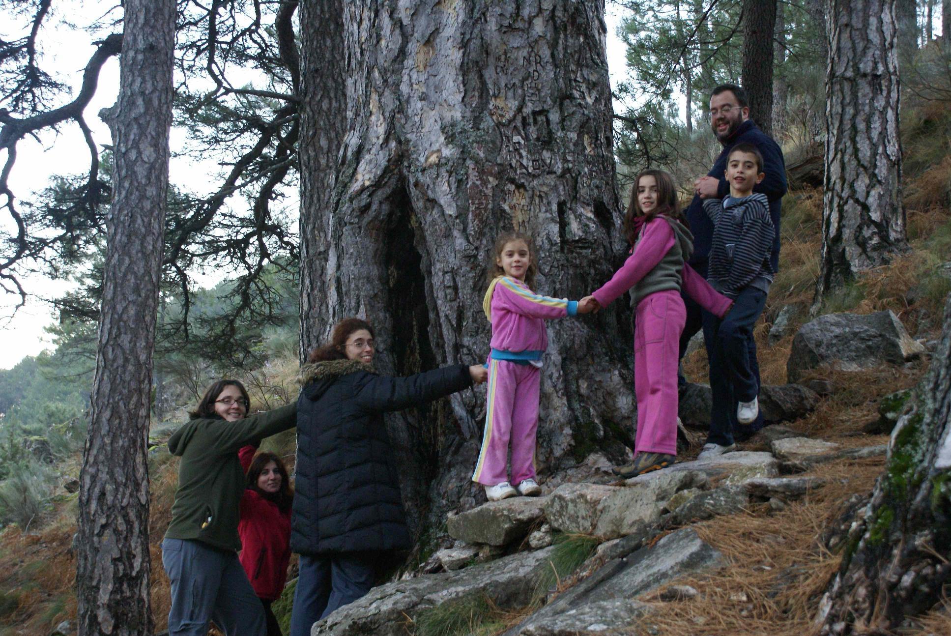 A eso de las 12:30 iniciamos la primera expedición de reconocimiento a la sierra de Gredos. Coche hasta “la cabra” en Guisando y cuesta arriba vadeando ríos para llegar a las casas de los cabreros donde caímos rendimos por inanición y nos apretamos unos bocatas de queso de cabra buenísimo y unos filetillos de pollo y lomo. Los niños encantados explorando las casas de los cabreros, Pablo incluido aunque eso de andar no lo tiene del todo claro. Todavía. La excursión se completó por la tarde yendo a visitar al “pino Bartolo”, un ejemplar de pino negro de impresionante porte que le ha hecho famoso en la zona. Un inciso dedicado a Félix y Antonia, pues no dejaba de recordar en nuestra PI cuando fuimos a ver “el Roblón”: aunque el pino este era bastante más alto, en perímetro ni se aproximaba al roblón de Cervera del Pisuerga. A lo que iba, que cuando Jose Mejías vio la peazo cuesta que había que trepar para llegar al susodicho pino se acordó de Alberto y de la jornada de escalada que le espera, y con una risa esperanzada en que una cosa convalidase la otra, se subió hasta el pino Bartolo sin rechistar y vaya con la cuestecita. Los niños encantados y corriendo como si eso de la cuesta fuese divertido, Pablo dormido en una mochila de montaña a espaldas de los dos Joses a turnos. Aunque no hay que contarlo todo, no me puedo privar de reseñar la tremenda culada que se pegó Jose Mejias, aunque no hay documento gráfico que lo pruebe, en el momento del descenso. El día concluyó en casa con una oración en la que participaron los niños. Utilizamos las manos y plastilina para expresar lo que todos sentíamos, nuestras esperanzas y los miedos ante los próximos días. Fue un rato precioso y el resultado sí esta registrado en foto. ¿Veis algún parecido con la foto del pino?