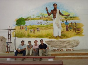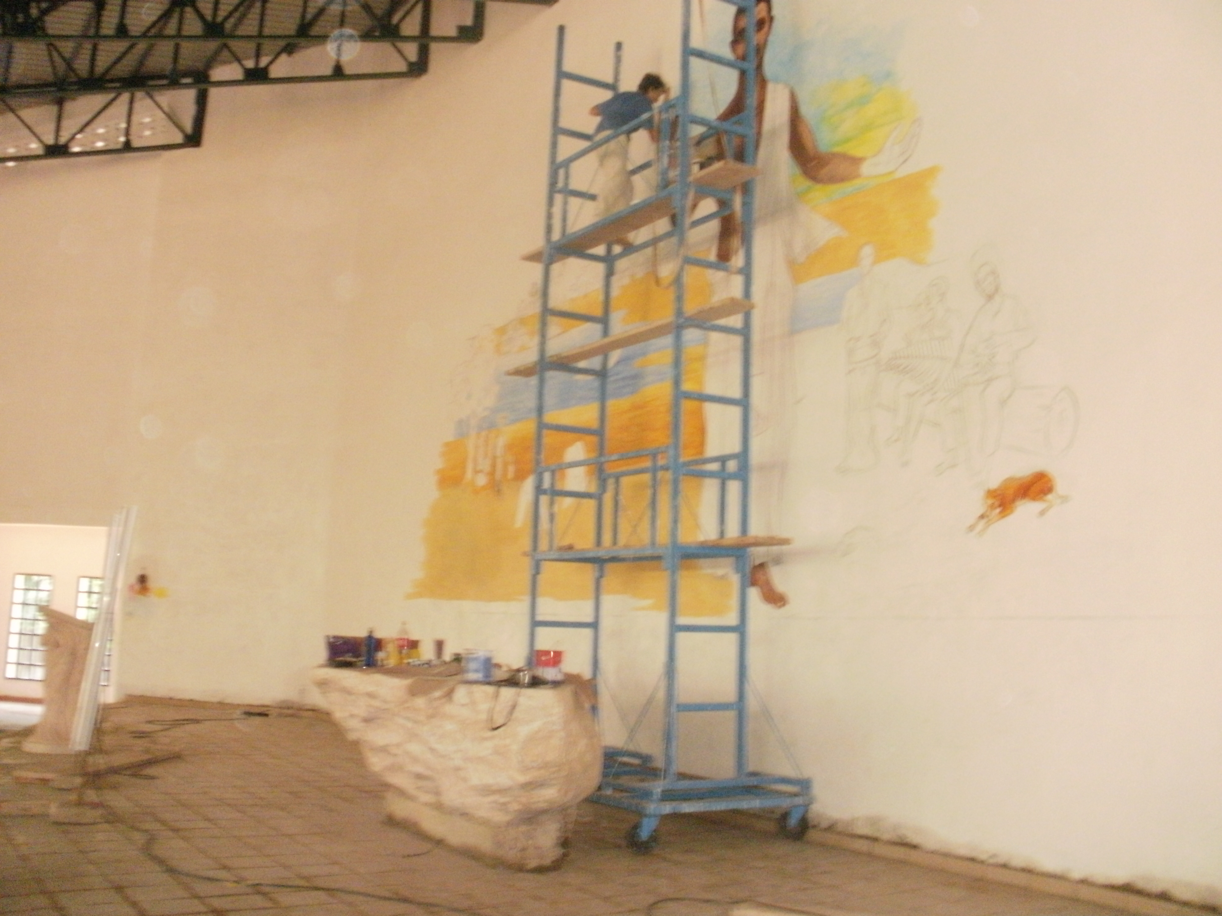 Ya allí, nos quedamos asombrados del tamaño tan grande de la pared. A partir de esta realidad comenzamos a pensar y fueron surgiendo ideas. Fue entonces cuando vimos la posibilidad de pintar los elementos que permiten “dar vida” a éste pueblo: el agua y la pesca en sus hermosos ríos, el arroz, el mijo, sus poblados, la música que alegra sus celebraciones… Todo esto les permite vivir y les da esperanza, y esto lo relacionaba y pensaba en cómo la figura de Jesús Resucitado, así mismo, da sentido y VIDA a la de cualquier creyente. Miguel A. también nos animó en la idea y ya no nos paró nada.