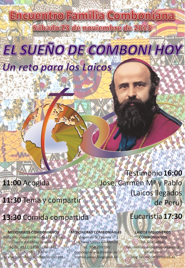 Bajo el lema: ”EL SUEÑO DE COMBONI HOY, UN RETO PARA LOS LAICOS”, queremos acercarnos y profundizar en el sueño de Comboni que le llevó a consagrar su vida a la misión y ver cuáles son los retos que nos plantea en nuestro mundo de hoy.