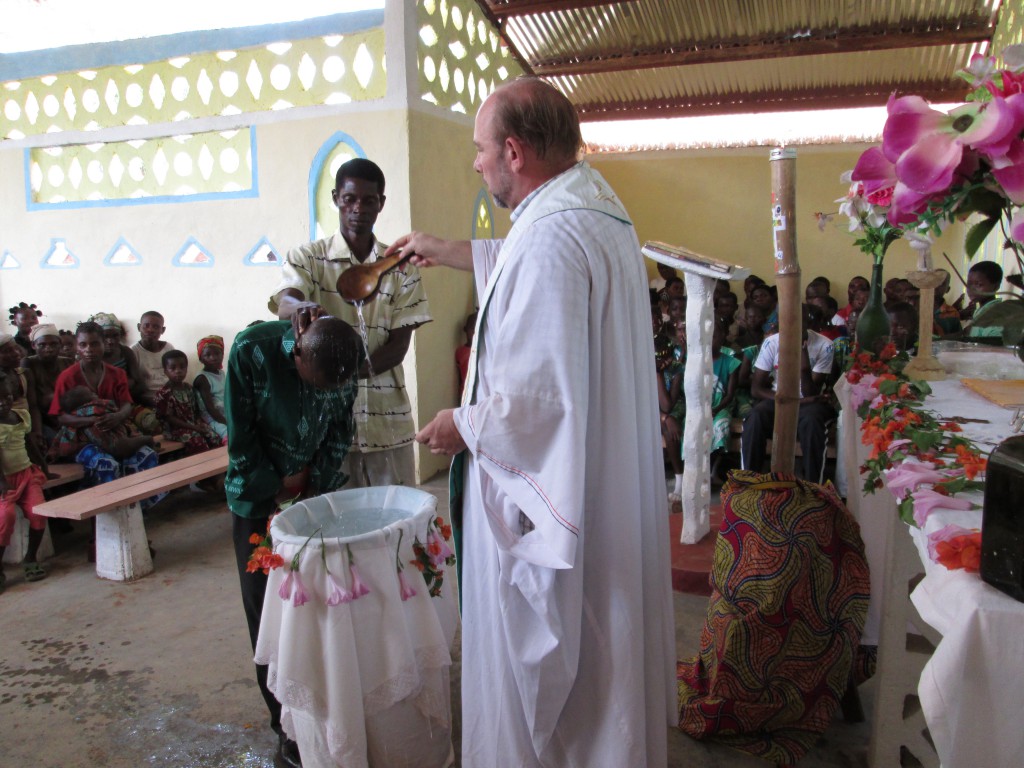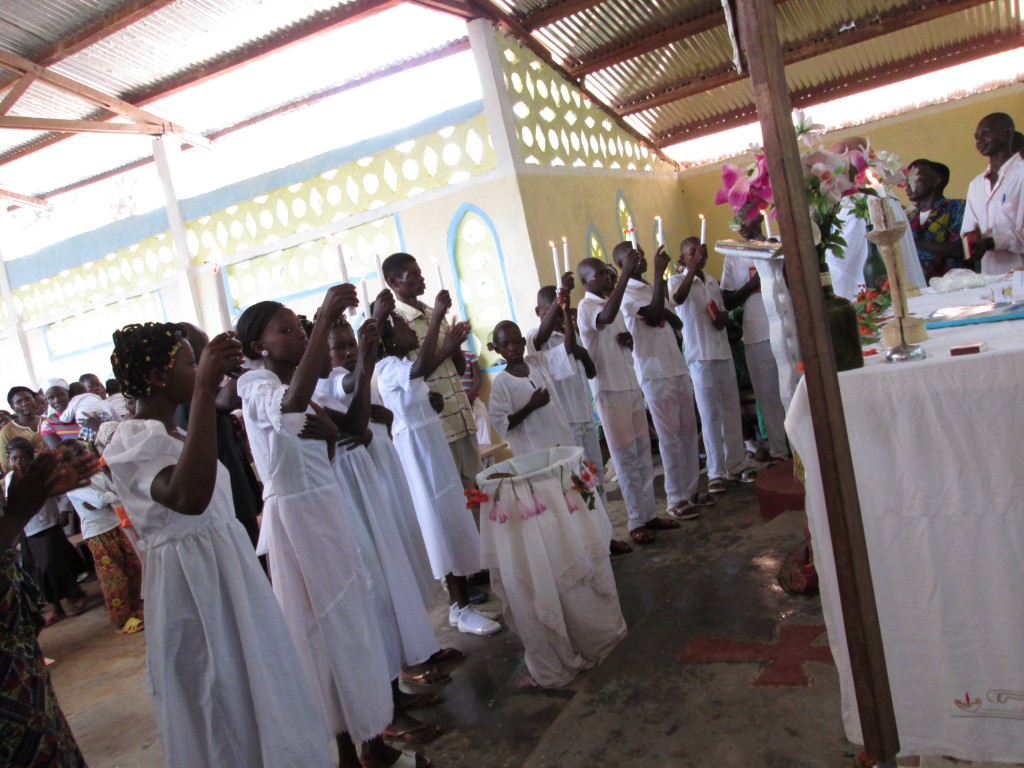 La misa comenzó con una procesión de entrada al ritmo de un canto con cientos de voces vibrantes, de los tambores y la danza. Era la fiesta que comenzaba. En el momento oportuno fueron llamados los catecúmenos que, con decidida y poderosa voz respondían al sacerdote: “Quiero el bautismo de la Iglesia”. Fueron entonces bautizados, uno tras otro, en el nombre del Padre, y del Hijo, y del Espíritu Santo. Seguidamente todos salen de la iglesia y dejan a un lado su ropa de calle y vestidos ahora todo de blanco, entran de nuevo en procesión hacia el altar de la iglesia, cantando y bailando, sintiendo la verdadera alegría de los hijos de Dios y de la Iglesia; de la mano de sus padres, reciben la vela encendida del Cirio Pascual para continuar cantando y bailando alrededor del altar, sosteniendo, no la espada de la muerte sino la luz de las velas de la vida que les fue entregada desde el Altar de Cristo que ellos rodeaban con entusiasmo. Realmente me conmovió y dejé rodar algunas lágrimas. Miré el reloj y eran las 10,15 horas, recordé entonces que se estaba celebrando la Misa, también en mi parroquia, en Torredeita, con la diferencia de que aquí ¡se había iniciado a las 9:00 am! Me sentí en sintonía con los que dejé, pero profundamente enraizada en el pueblo que el Señor me ofrece con tanta ternura y benevolencia.