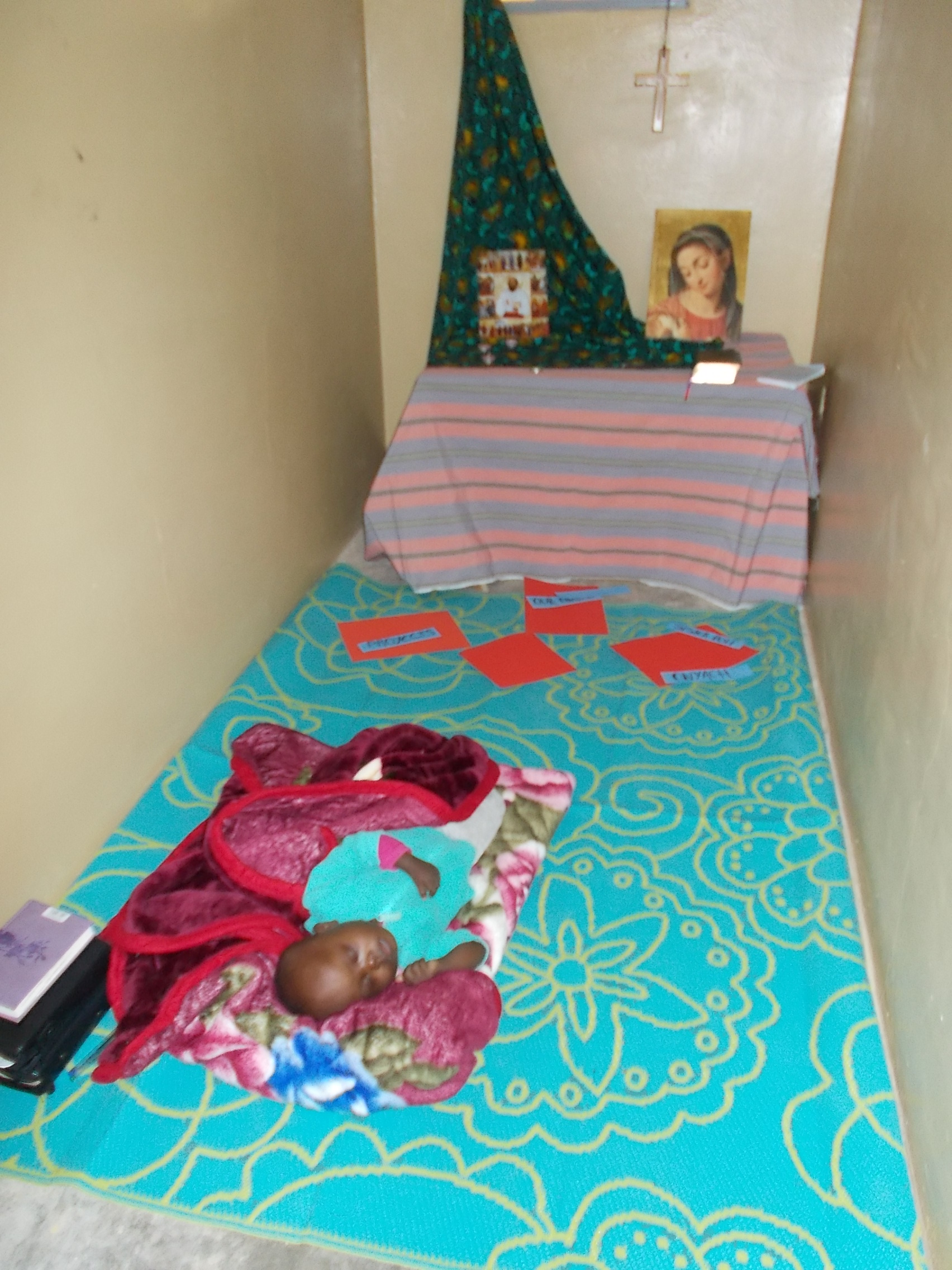 Estamos muy bien, como os dijo Isidro en el otro correo. Tenemos una Comunidad muy bonita, unida, equilibrada porque somos cuatro tipos diferentes pero compenetrados. Todas tenemos nuestro espacio aquí, todas nos sentimos “útiles” y aceptadas de una manera diferente y eso hace que nadie se sienta fuera de lugar. Os mando una foto de la capilla de nuestra casa, pequeñita y acogedora (con el pequeño Moses echándose una siesta), y con “vuestro” Comboni.Lugar importante «de encuentro» de nuestra comunidad…..