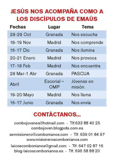 Encuentros Jóvenes en misión. Curso 17/18 Publicado el 6 octubre, 20175 octubre, 2017 por Isidro y Esther La familia comboniana vuelve con los encuentros combojoven «Jóvenes en misión». Ven a conocer a otros jóvenes con tu misma inquietud misionera. ¡Contáctanos! Tu voto:Comparte en: Compartir en Telegram (Se abre en una ventana nueva) Telegram Compartir en LinkedIn (Se abre en una ventana nueva) LinkedIn Haz clic en Pinterest (Se abre en una ventana nueva) Pinterest Comparte en Facebook (Se abre en una ventana nueva) Facebook Compartir en WhatsApp (Se abre en una ventana nueva) WhatsApp Enviar un enlace a un amigo por correo electrónico (Se abre en una ventana nueva) Correo electrónico Compartir en X (Se abre en una ventana nueva) X Más Compartir en Reddit (Se abre en una ventana nueva) Reddit Compartir en Menéame (Se abre en una ventana nueva) Menéame Compartir en Tuenti (Se abre en una ventana nueva) Tuenti Imprimir (Se abre en una ventana nueva) Imprimir Me gusta Cargando... Relacionado