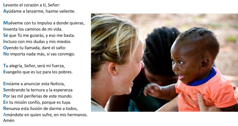 La misión te espera Publicado el 22 octubre, 201721 octubre, 2017 por Isidro y Esther En el día del DOMUND nos unimos a toda la Iglesia orante y pedimos al dueño de la mies que siga suscitando vocaciones misioneras que lleven la Buena Noticia a todos los rincones de la Tierra. Tu voto:Comparte en: Compartir en Telegram (Se abre en una ventana nueva) Telegram Compartir en LinkedIn (Se abre en una ventana nueva) LinkedIn Haz clic en Pinterest (Se abre en una ventana nueva) Pinterest Comparte en Facebook (Se abre en una ventana nueva) Facebook Compartir en WhatsApp (Se abre en una ventana nueva) WhatsApp Enviar un enlace a un amigo por correo electrónico (Se abre en una ventana nueva) Correo electrónico Compartir en X (Se abre en una ventana nueva) X Más Compartir en Reddit (Se abre en una ventana nueva) Reddit Compartir en Menéame (Se abre en una ventana nueva) Menéame Compartir en Tuenti (Se abre en una ventana nueva) Tuenti Imprimir (Se abre en una ventana nueva) Imprimir Me gusta Cargando... Relacionado