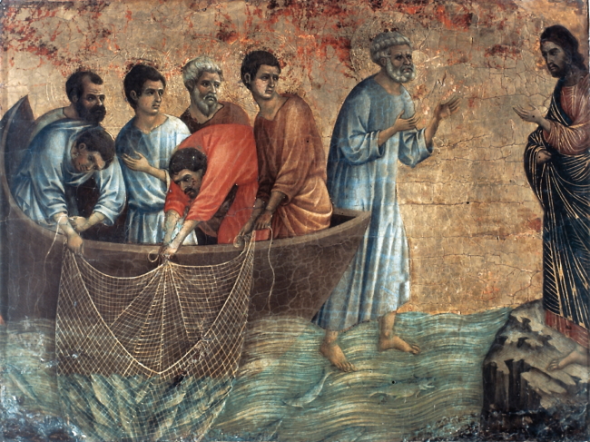 Y, puestos a la obra, hicieron una redada tan grande de peces que las redes comenzaban a reventarse. Entonces hicieron señas a los compañeros, que estaban en la otra barca, para que vinieran a echarles una mano. Vinieron y llenaron las dos barcas, hasta el punto de que casi se hundían. Al ver esto, Simón Pedro se echó a los pies de Jesús diciendo: