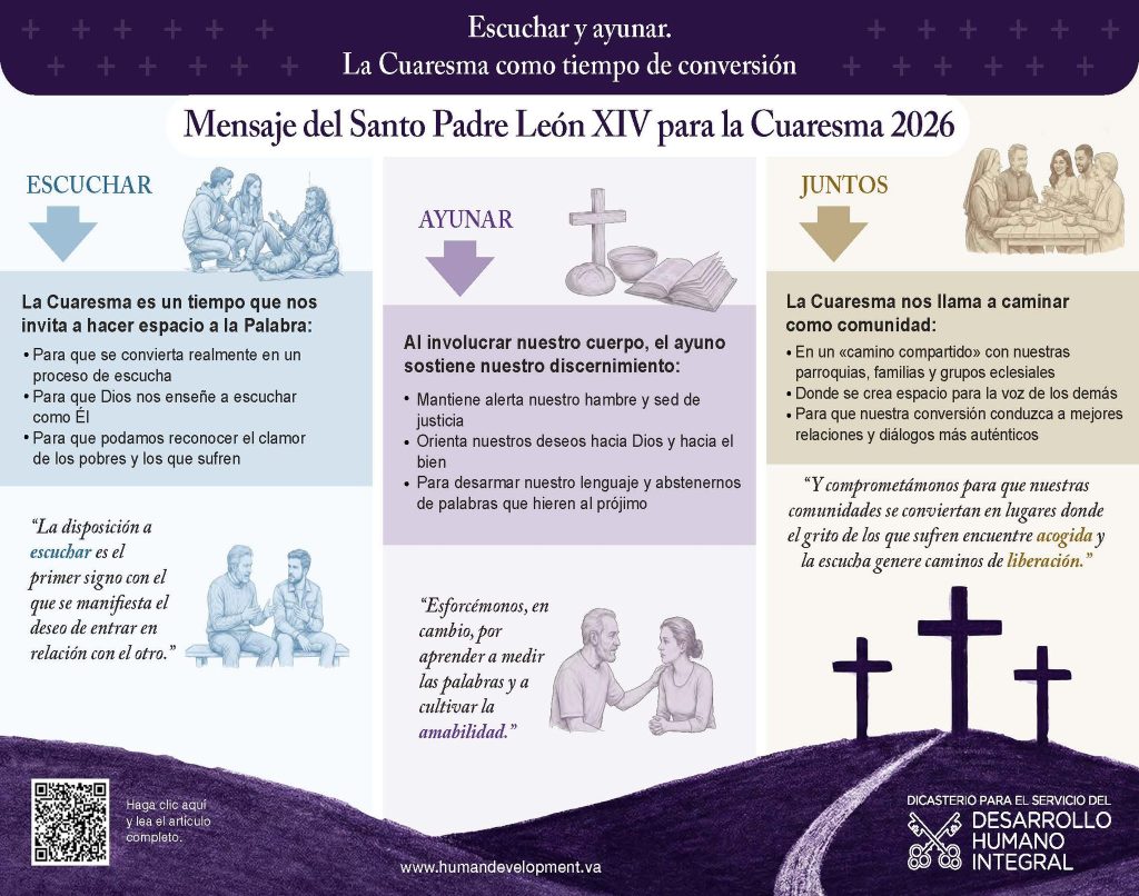 Del mismo modo, nuestras parroquias, familias, grupos eclesiales y comunidades religiosas están llamados a realizar en Cuaresma un camino compartido, en el que la escucha de la Palabra de Dios, así como del clamor de los pobres y de la tierra, se convierta en forma de vida común, y el ayuno sostenga un arrepentimiento real. En este horizonte, la conversión no sólo concierne a la conciencia del individuo, sino también al estilo de las relaciones, a la calidad del diálogo, a la capacidad de dejarse interpelar por la realidad y de reconocer lo que realmente orienta el deseo, tanto en nuestras comunidades eclesiales como en la humanidad sedienta de justicia y reconciliación.