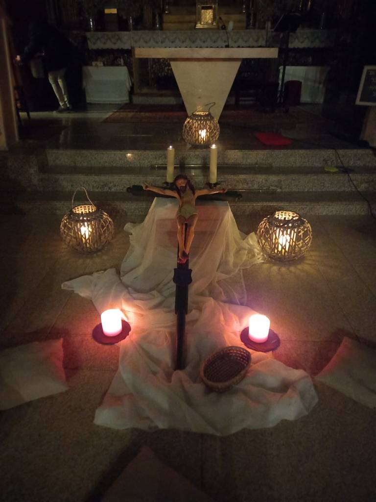 La noche la terminamos en Santa Cruz, donde compartimos la adoración de la cruz con sus vecinos y con el grupo de jóvenes de las cinco Villas que estaba celebrado una pascua juvenil. Un momento que prepararon muy bien y a través de las canciones y los gestos de adoración nos ayudaron a acompañar la muerte del Señor.