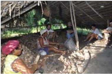 En el otro poblado también existe una cooperativa compuesta por un grupo de unas 40 familias, pero no tienen una zona de reserva RESEX delimitada. La única zona donde pueden recolectar el coco es una pequeña franja de selva rodeada de monocultivo de eucalipto, que pertenece a una empresa de celulosa. Es una situación incierta pues esas tierras también pertenecen a la empresa celulosa. Además de esto a la máquina que utilizan para extraer el mesocarpo se le quemó el motor hace más de tres meses. El arreglo costaba alrededor de 300 reales, pero no tenían ese dinero. Tenían la promesa por parte de las empresas de dotarles de una estructura para la extracción del aceite pero hasta el momento no lo habían cumplido.